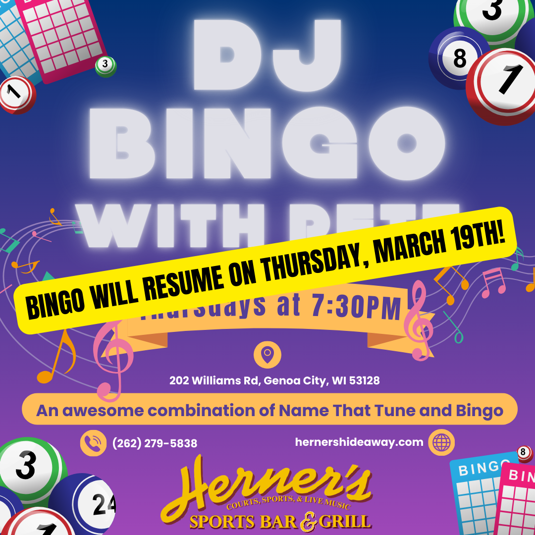DJ Bingo resumes! Thursday, March 19th 7:30PM