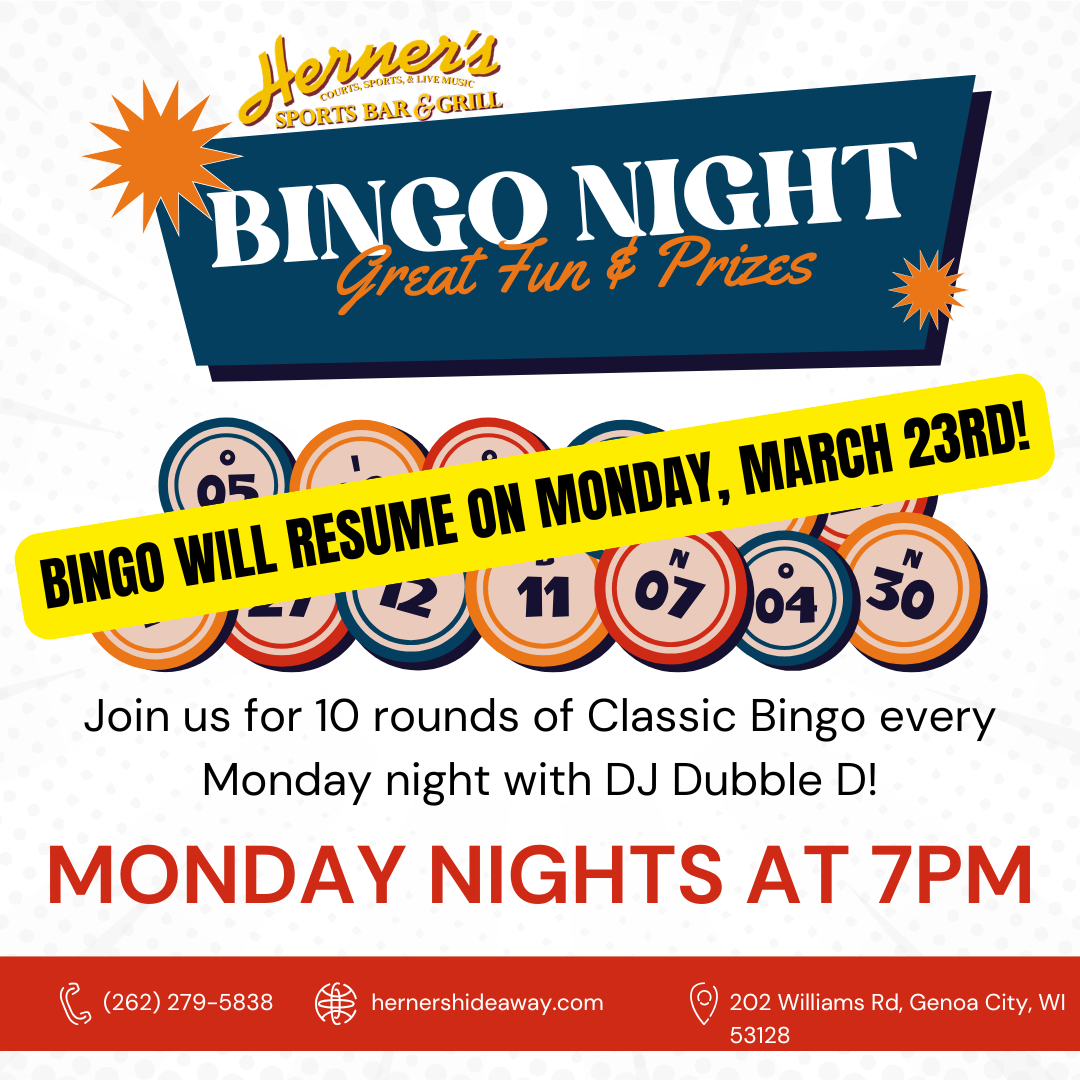 Monday Night Bingo resumes! Mon, March 23rd 7PM